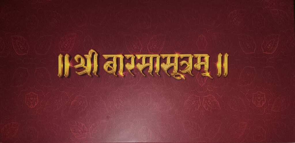Names and Significance : Currently , two names are prevalent: Shri Barsa sutra and Shri Kalpasutra. The name “Shri Barsa sutra” comes from the number of letters in this scriptural text. The total verse count of this scripture is 1,216. Since the additional 16 after 1,200 is small, it is not given much importance, and the verse count of this scripture is referred to as twelve hundred. Thus, this scripture of 1,200 verses has been named Shri Barsa sutra. Each verse contains thirty-two letters. Multiplying 1,216 by 32 gives 38,912 total letters.
